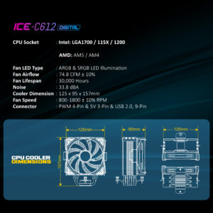 Armed with a high-density heatsink structure and a high-pressure 120mm ARGB fan, the ICE-C612 Digital delivers exceptional thermal performance. The copper-based contact plate ensures rapid heat transfer, while the optimized airflow design maximizes cooling efficiency even under heavy workloads.