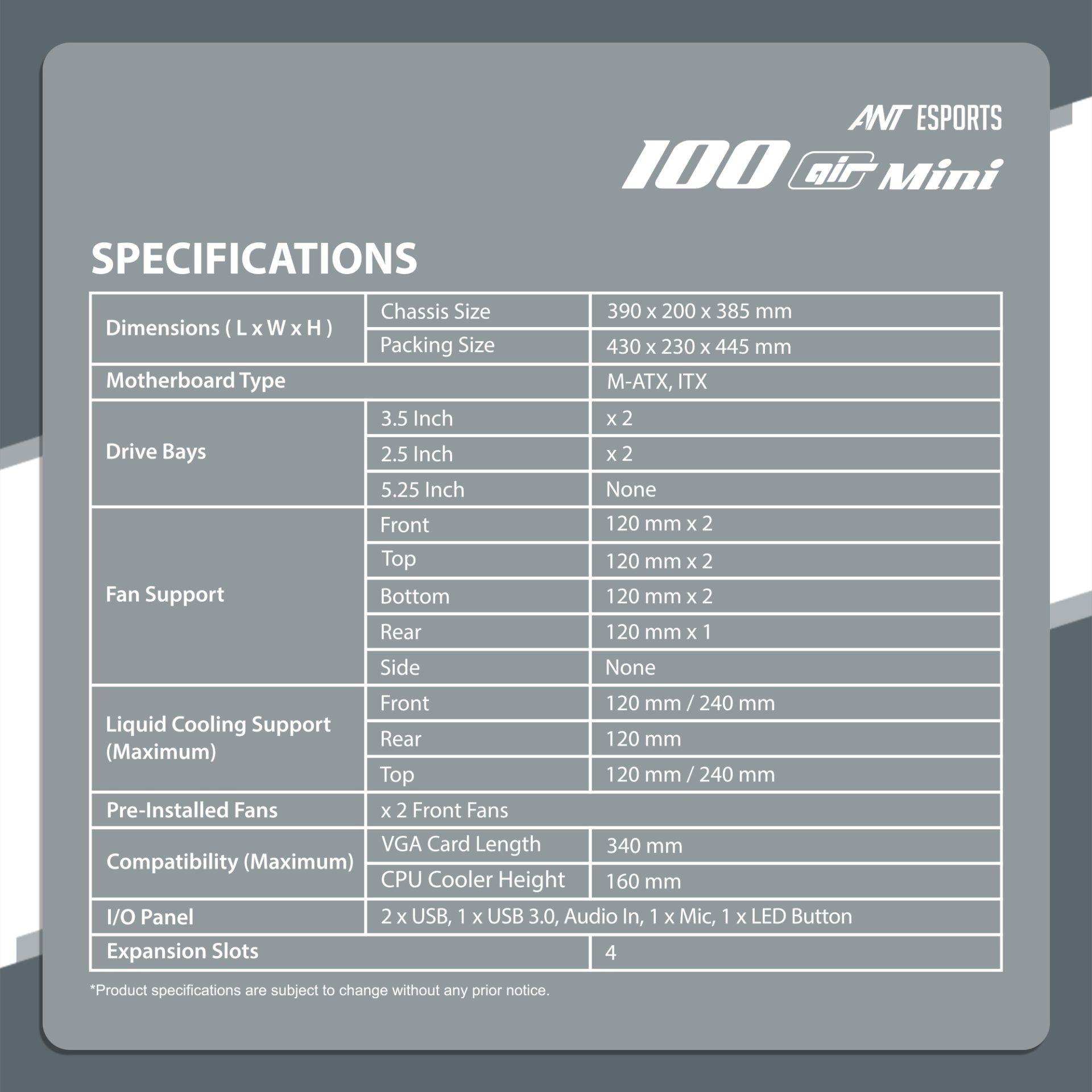 - Compact yet Powerful Design: The Ant Esports 100 Air Mini is a compact gaming PC cabinet designed to pack a punch. Its compact form factor is perfect for space-conscious setups, while still providing ample room for high-performance components.