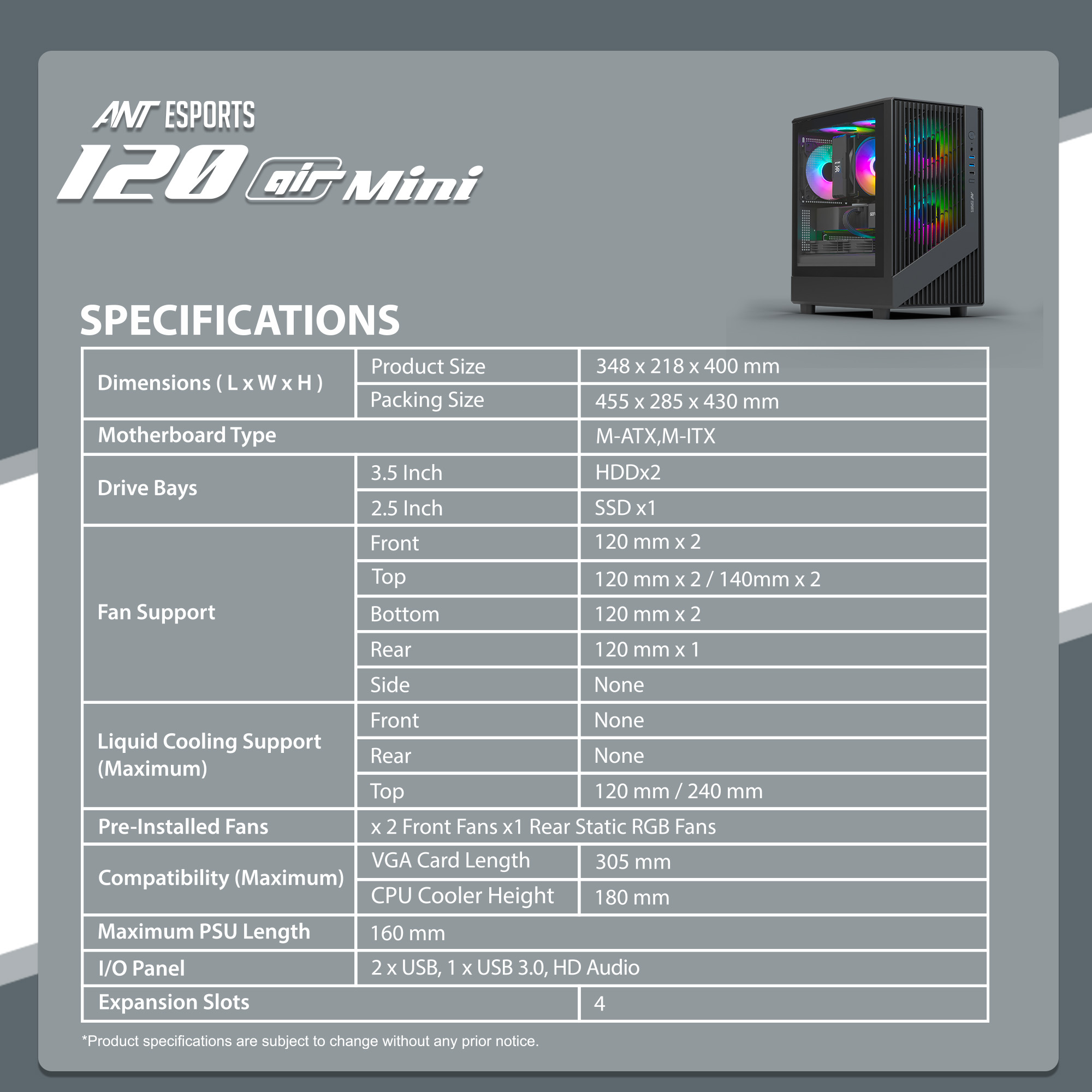 The Ant Esports 120 Air Mini is engineered to deliver maximum hardware compatibility within a compact form factor — ensuring you don’t have to compromise on your build’s performance.