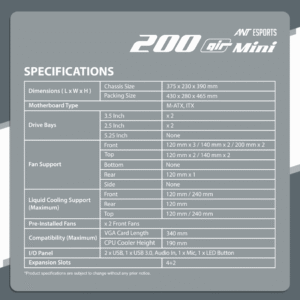 - Compatibility and Versatility – The Ant Esports 200 Air Mini supports up to mATX form factor motherboards, providing compatibility with a wide range of motherboard options. Furthermore, it can accommodate CPU air coolers measuring up to 190mm in height, ensuring compatibility with various cooling solutions. This versatility allows you to build a powerful gaming system that meets your specific requirements and preferences.
