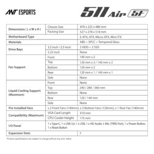 The Ant Esports 511 Air 5F is a high-airflow mid-tower PC case designed for performance-focused gaming enthusiasts and professional creators. Featuring a full mesh front panel and a total of five pre-installed cooling fans, it offers superior thermal efficiency right out of the box. Supporting E-ATX motherboards, large 410 mm GPUs, top-mounted 360 mm radiators, and a clean dual-chamber-inspired interior, the 511 Air 5F is built to handle powerful modern hardware while keeping temperatures extremely low. With its tempered glass side panel and premium build quality, it’s the perfect choice for any high-end gaming or productivity setup.