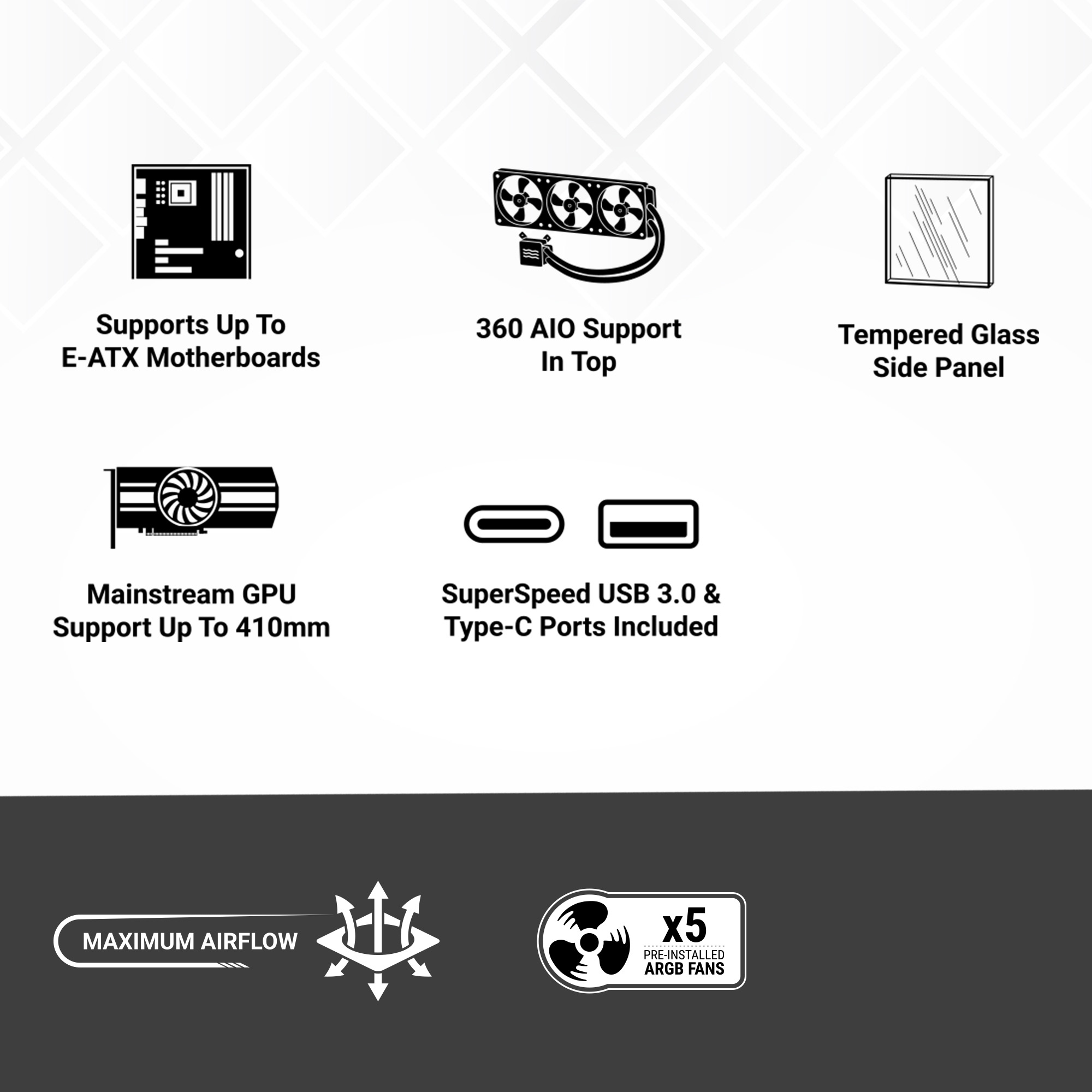 Premium Build Quality with tempered glass side panel and reinforced ABS + SPCC structure.