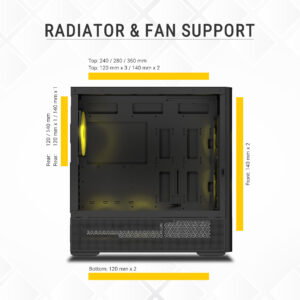 Top-Mounted Radiator Support for 240 / 280 / 360 mm liquid cooling solutions.