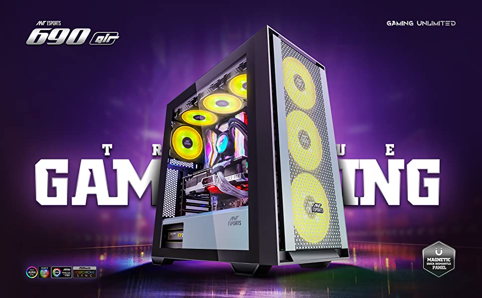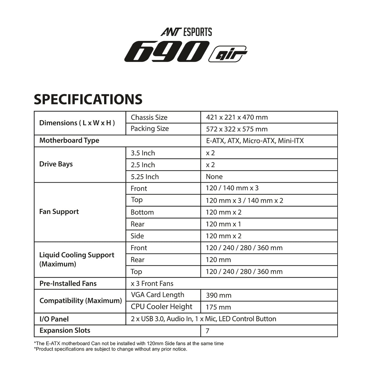 The Ant Esports 690 Air is a gaming cabinet delivering high-end premium features at a pocket-friendly price tag. The case supports up to E-ATX motherboards, multiple storage drives, and liquid coolers up to 360mm on top making it ideal for high-end gaming or production systems. With a front mesh panel with a magnetic dust filter and a direct airflow path the Ant Esports 690 Air not only keeps high-end gaming hardware cool under load but also prevents dust accumulation.
