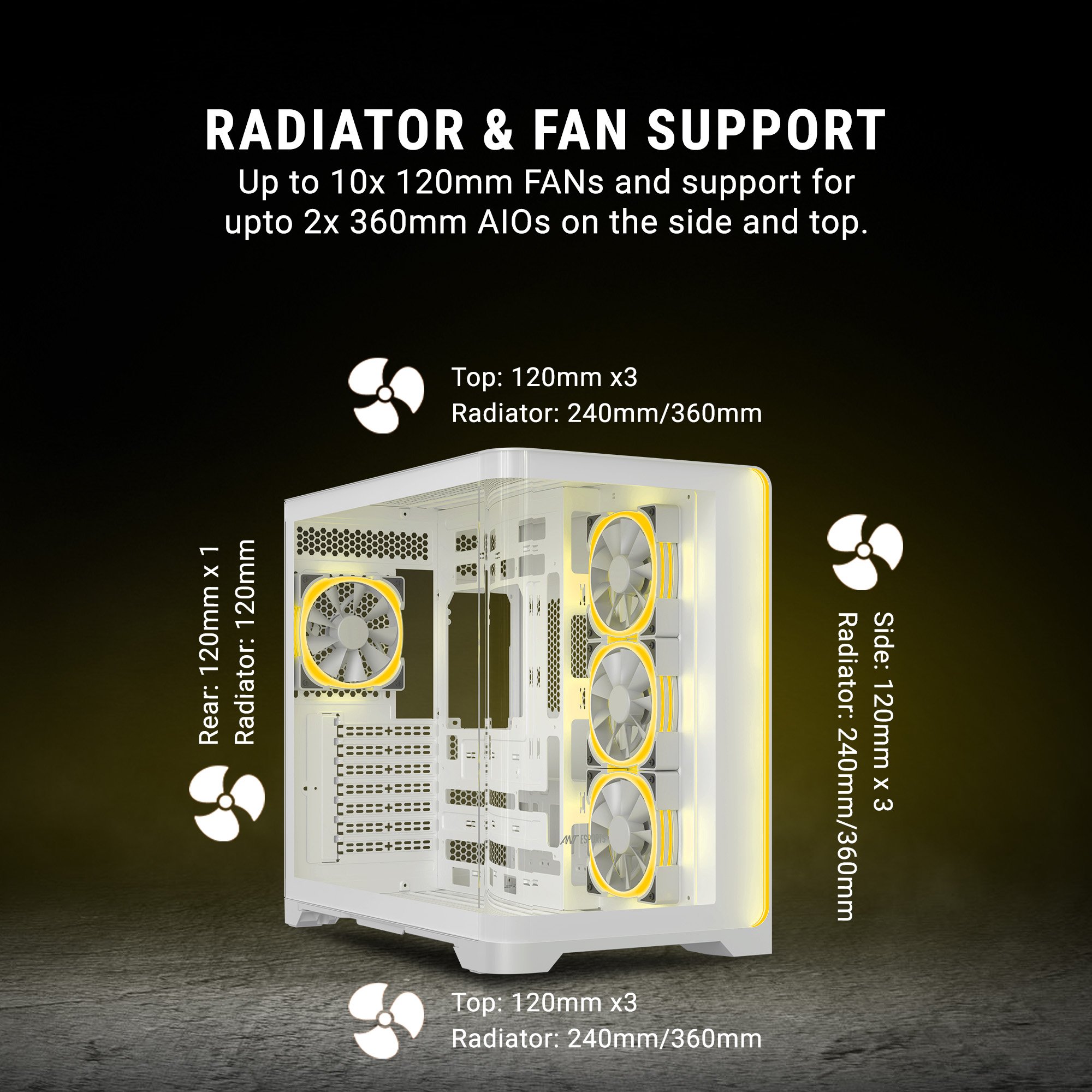 Extreme Cooling Potential – Supports up to 12 fans (3 side, 3 top, 3 bottom, 1 rear) with multi-radiator compatibility up to 360 mm.