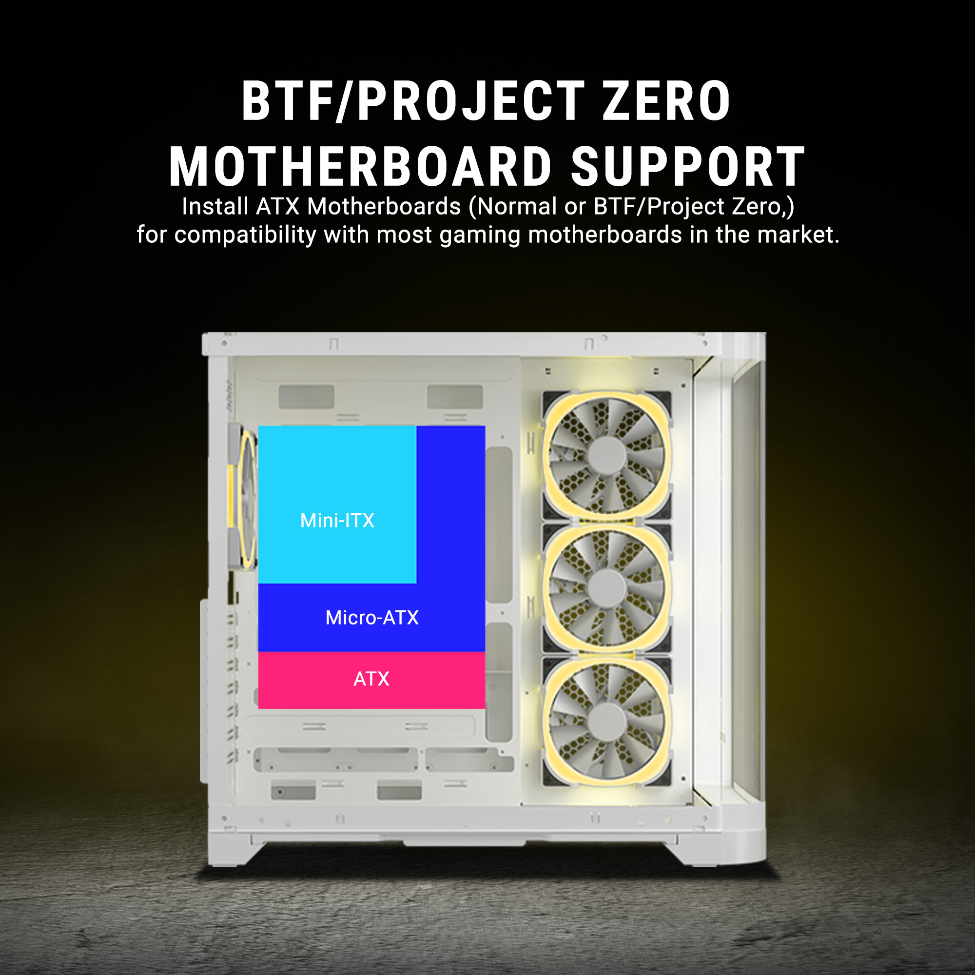 BTF-Compatible Motherboard Support – Clean, cable-less look by supporting back-connector (BTF) enabled motherboards.