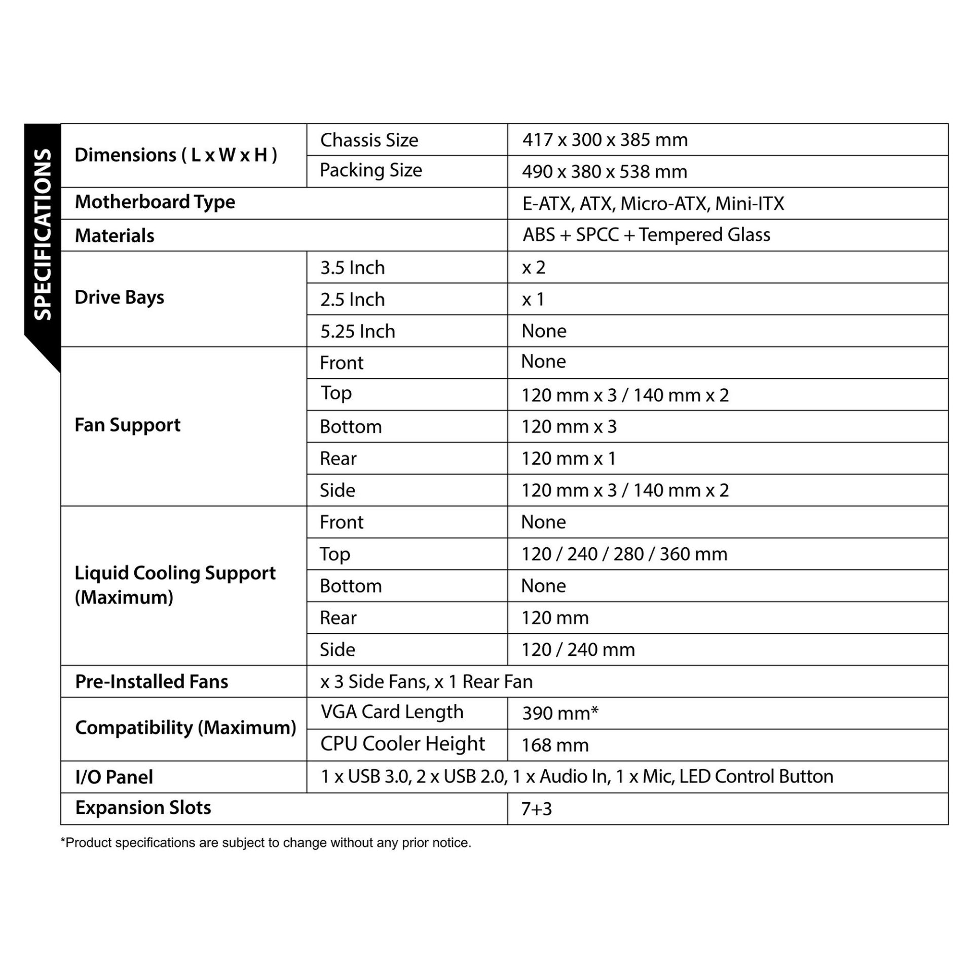 - Extreme Compatibility: Supporting up to E-ATX motherboards, the Crystal cabinet is equipped to handle a wide range of system configurations. Its generous CPU cooler clearance of up to 168mm accommodates even the tallest air coolers, while the top panel can house up to a 360mm radiator for liquid cooling enthusiasts, ensuring optimal cooling performance.