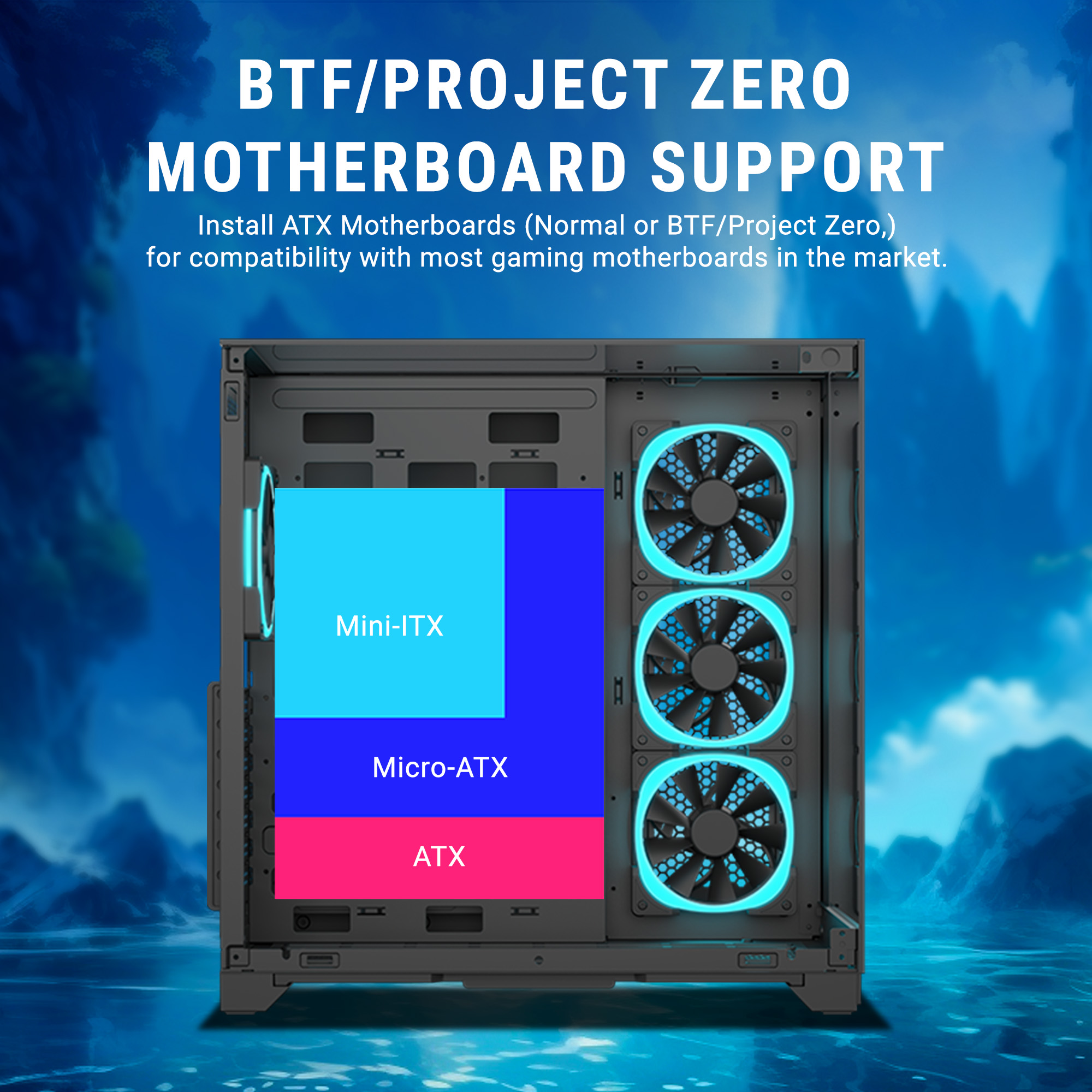 BTF Motherboard Supported – Enjoy ultra-clean builds with hidden connectors using ATX, Micro-ATX, and Mini-ITX (BTF compatible).