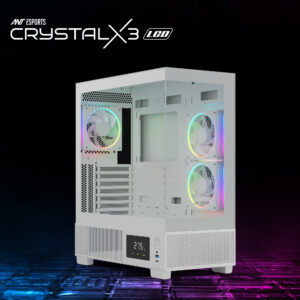 Introducing the Ant Esports Crystal X3 LCD, a premium white dual-chamber ATX PC case designed for enthusiasts who demand both stunning visuals and powerful performance. With a sleek tempered glass exterior and a built-in LCD display, this case is engineered to enhance your gaming and productivity setup through real-time monitoring and customizable system visuals.