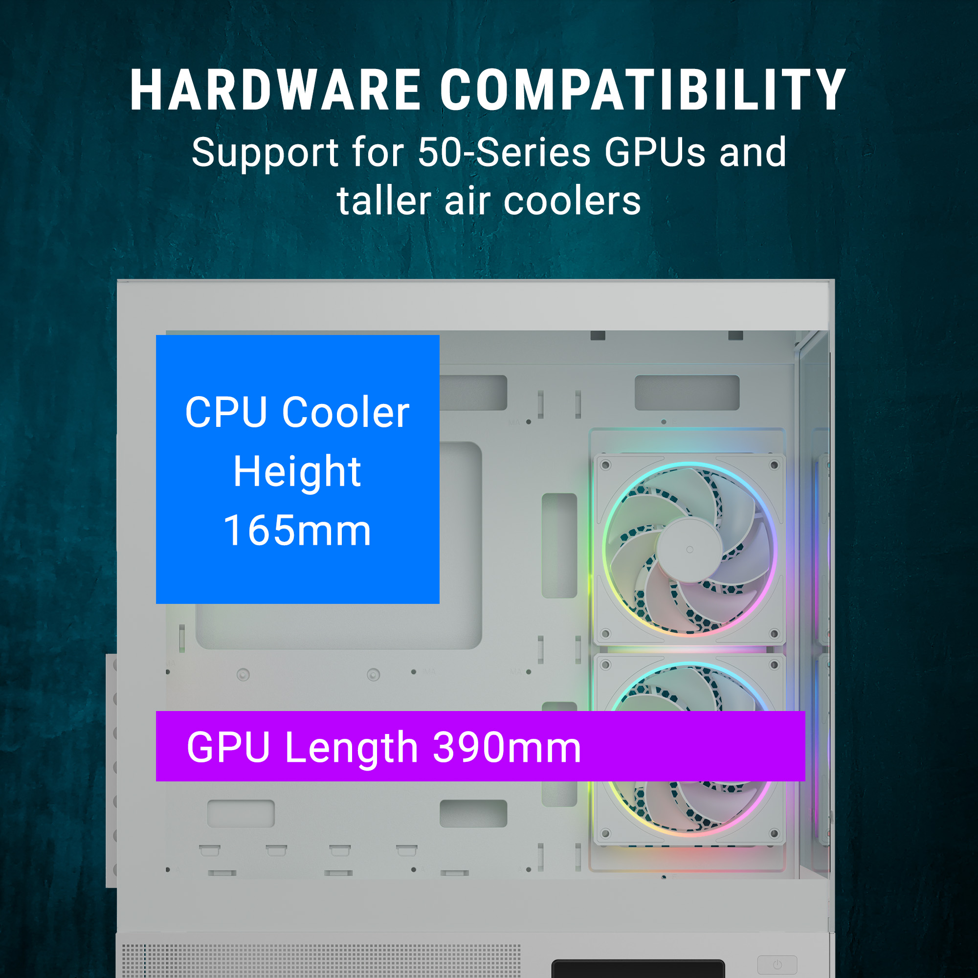 A spacious interior supports flagship GPUs up to 390mm, full-size ATX motherboards, and tall CPU air coolers up to 165mm—making it ideal for next-gen gaming hardware.