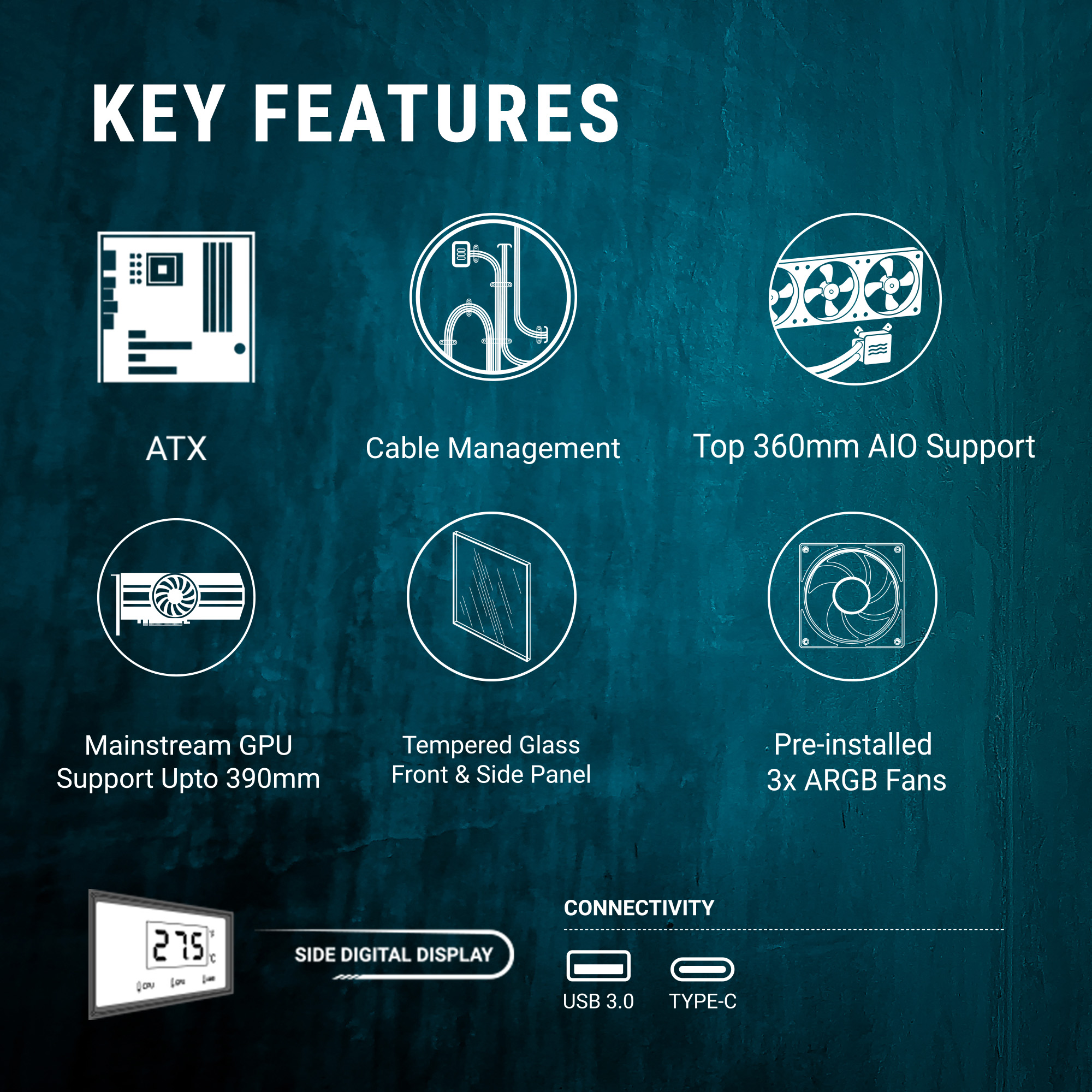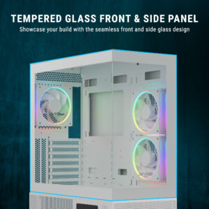 Pre-installed with three high-performance ARGB fans, the case delivers impressive airflow out of the box while offering dynamic lighting effects. Hardware compatibility is extensive, with support for 390mm GPUs, 165mm CPU coolers, and multiple storage configurations, making it an ideal choice for high-end gaming builds and workstation setups.