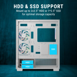Inside the airy dual-chamber structure, the case supports high-performance cooling with room for up to eight 120mm fans and a top-mounted 360mm radiator for extreme cooling potential. Flexible storage options combined with premium ARGB fans deliver both form and function.