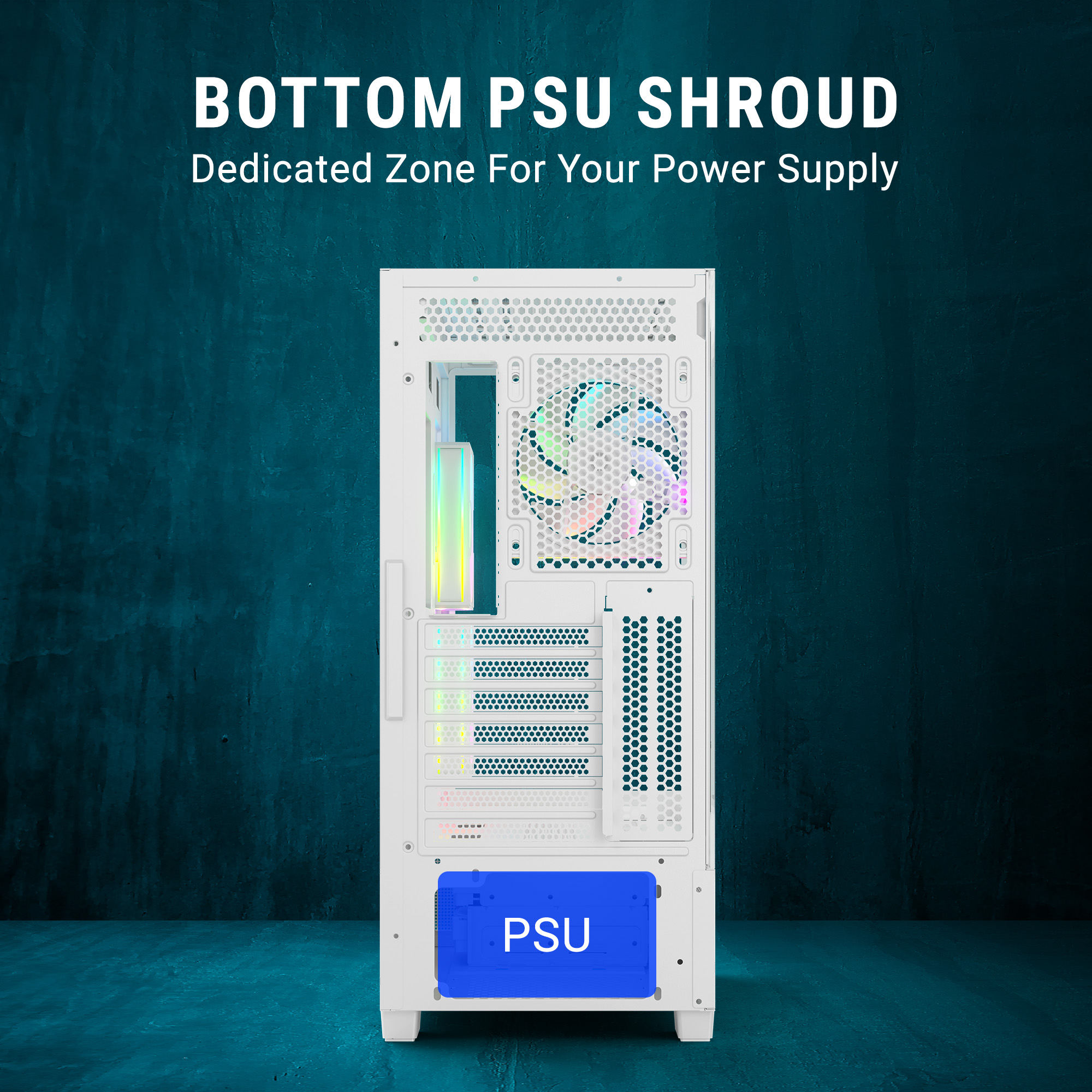 Separates the power supply and storage behind a dedicated compartment for improved airflow, cable management, and a clean aesthetic.