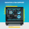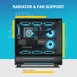 Extensive cooling options: multiple fan mounts (top, bottom, side, rear) and support for large liquid cooling radiators (top up to 360 mm, rear 120 mm) for advanced builds.