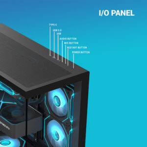Front I/O panel with modern connectivity including USB Type-C and USB 3.0 ports for convenient access.