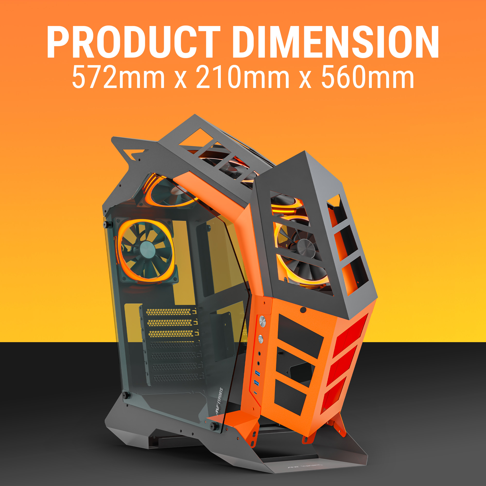 The product dimensions of 572mm x 210mm x 560mm indicate a spacious and well-proportioned design, providing ample room for high-performance components. The 572mm height and 560mm depth allow compatibility with large GPUs, cooling systems, and multiple storage devices, while the 210mm width ensures sufficient airflow and cable management space. This size makes it ideal for enthusiast builds, offering both functionality and aesthetics.