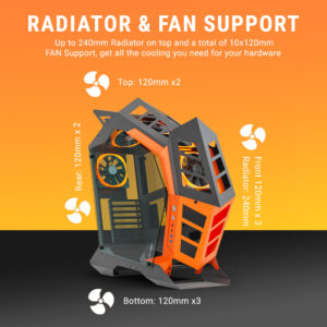 The case supports a 240mm radiator on the top, allowing efficient liquid cooling for high-performance components. Additionally, with a total support for 120mm fans, it ensures optimal airflow and heat dissipation. This setup provides flexibility for both air and liquid cooling configurations, keeping your hardware at ideal temperatures for peak performance and longevity.
