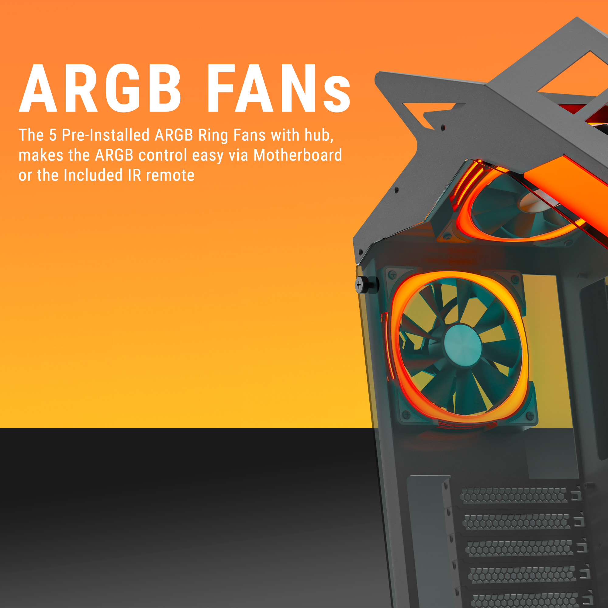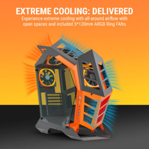- 5 x 120mm ARGB Ring Fans – The chassis comes with five 120mm ARGB ring fans pre-installed, providing powerful airflow and vibrant, customizable RGB lighting to enhance both cooling and visual appeal.