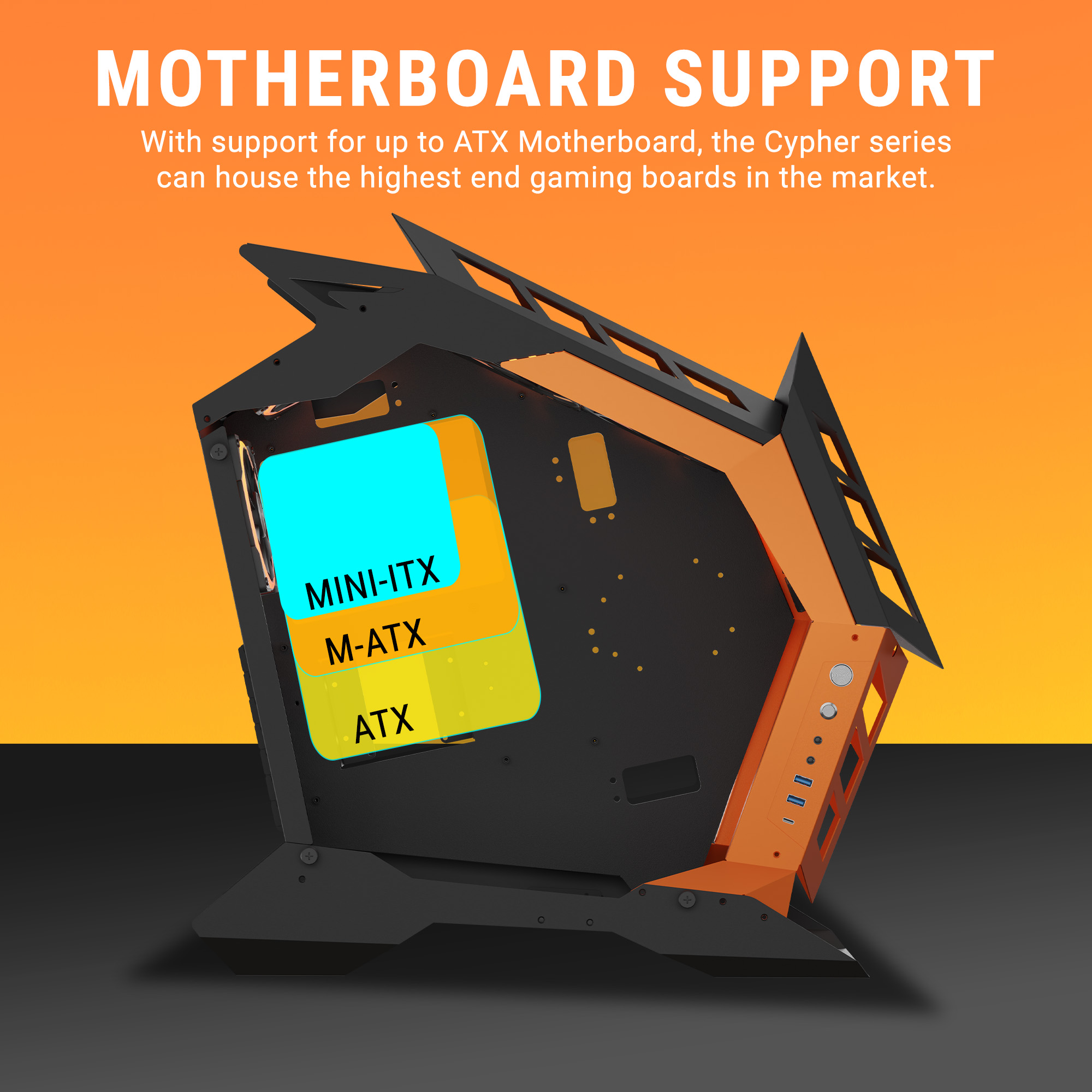 The Cypher series case supports up to ATX motherboards, making it compatible with a wide range of high-end gaming boards. This ensures ample space for advanced features such as multiple PCIe slots, high-speed RAM, and powerful cooling solutions. With this flexibility, users can build a high-performance gaming or workstation PC with top-tier components and expansion options.