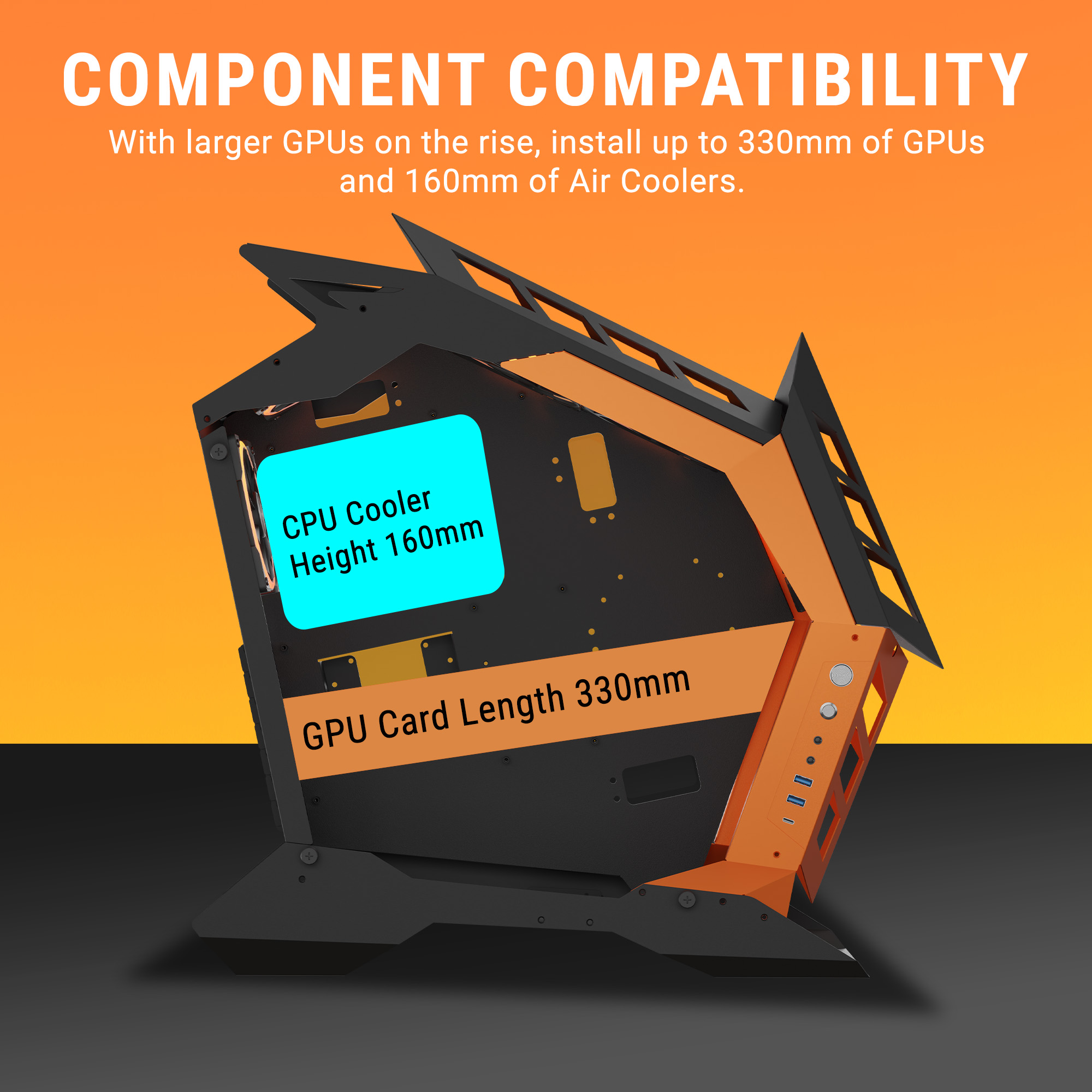 The case is designed to accommodate GPUs up to 330mm in length, ensuring compatibility with modern, high-performance graphics cards. Additionally, it supports air coolers up to 160mm in height, allowing for efficient cooling solutions. This spacious design makes it ideal for gaming and workstation builds, providing flexibility for powerful components without space constraints.