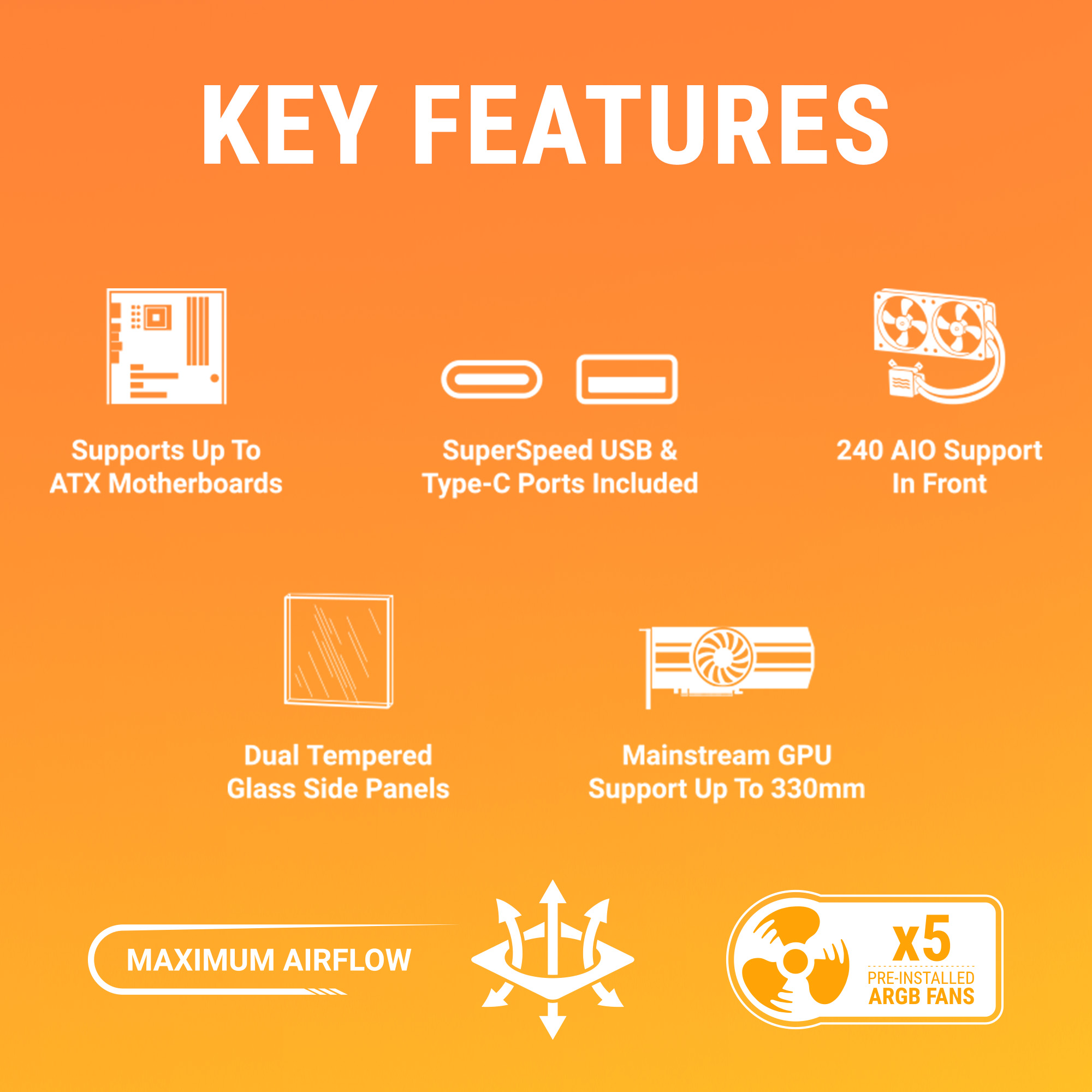 - All-Around Airflow – The chassis is designed with open spaces throughout, ensuring unobstructed airflow that maximizes cooling efficiency, preventing heat buildup and maintaining optimal performance even under heavy load.