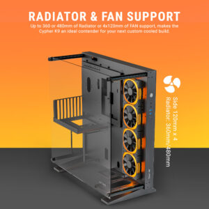- Up to 480mm Radiator Support – The Cypher K9 offers support for an impressive 480mm radiator, making it compatible with high-performance liquid cooling solutions for users looking to push their hardware to the limit.