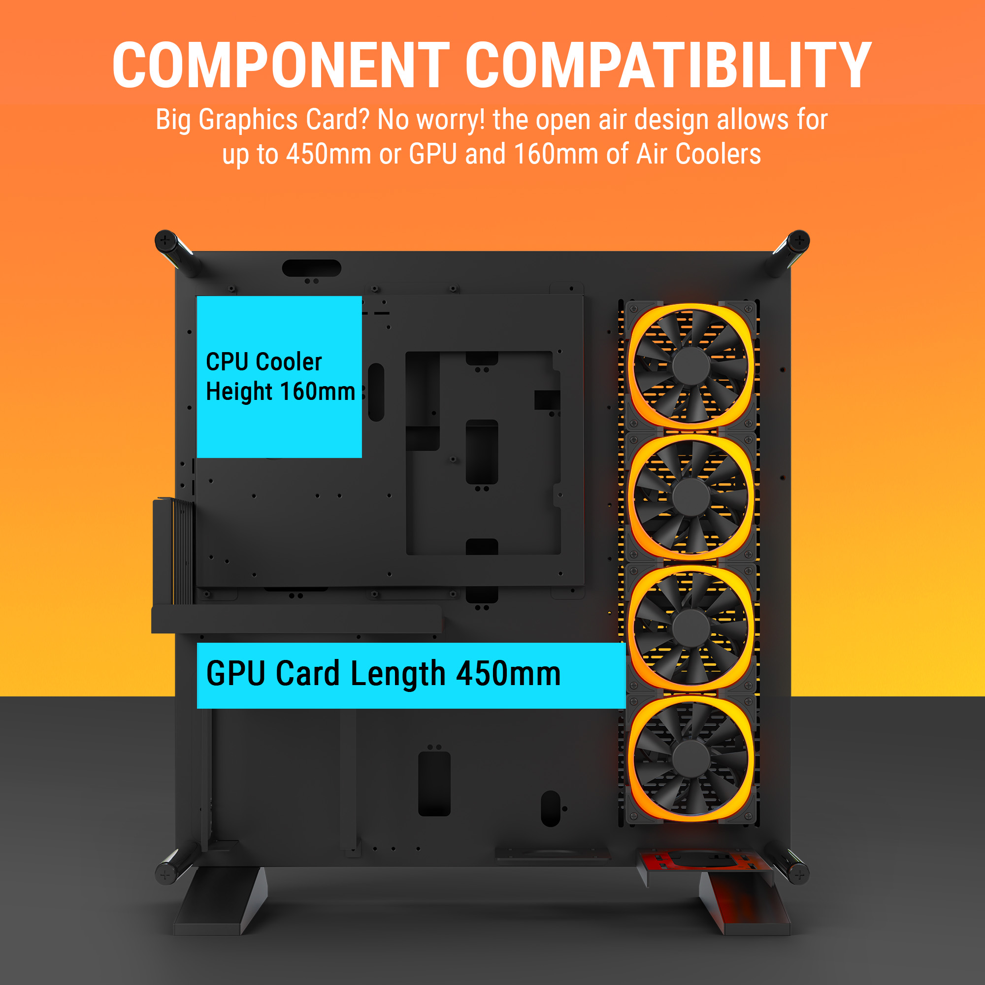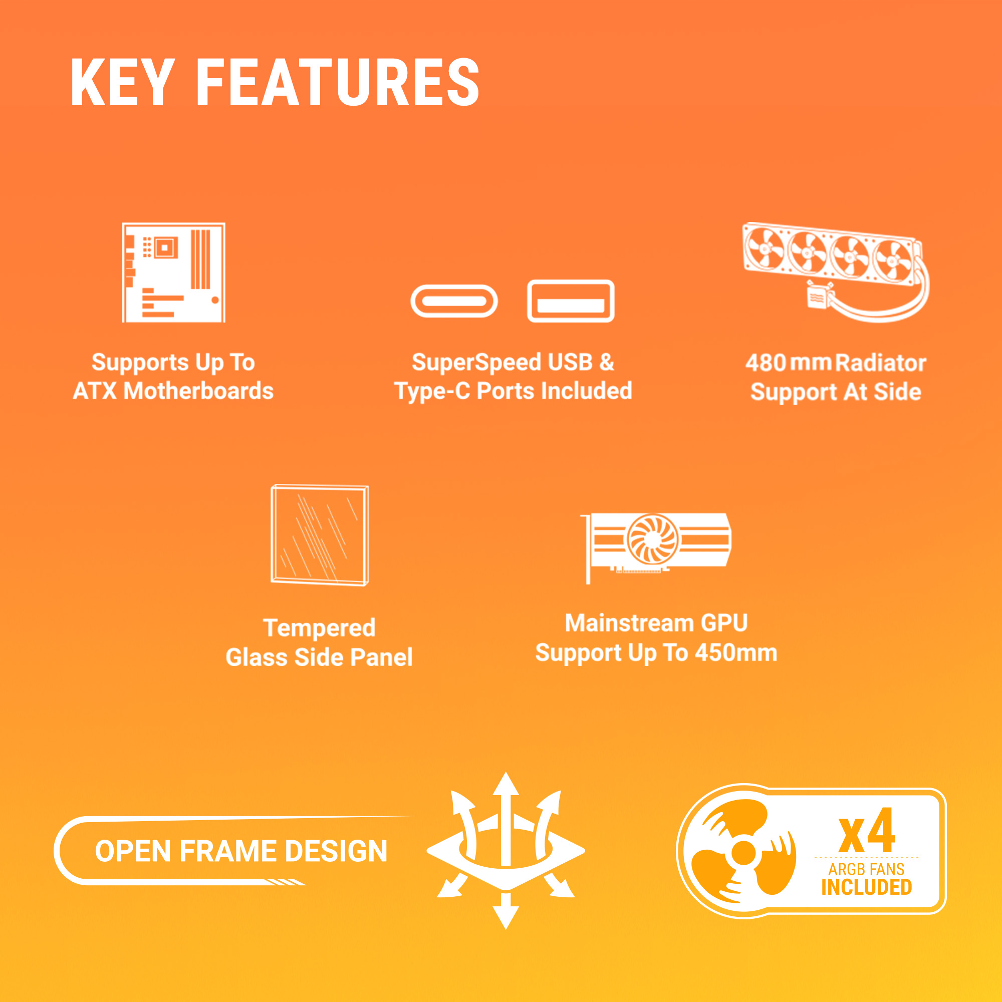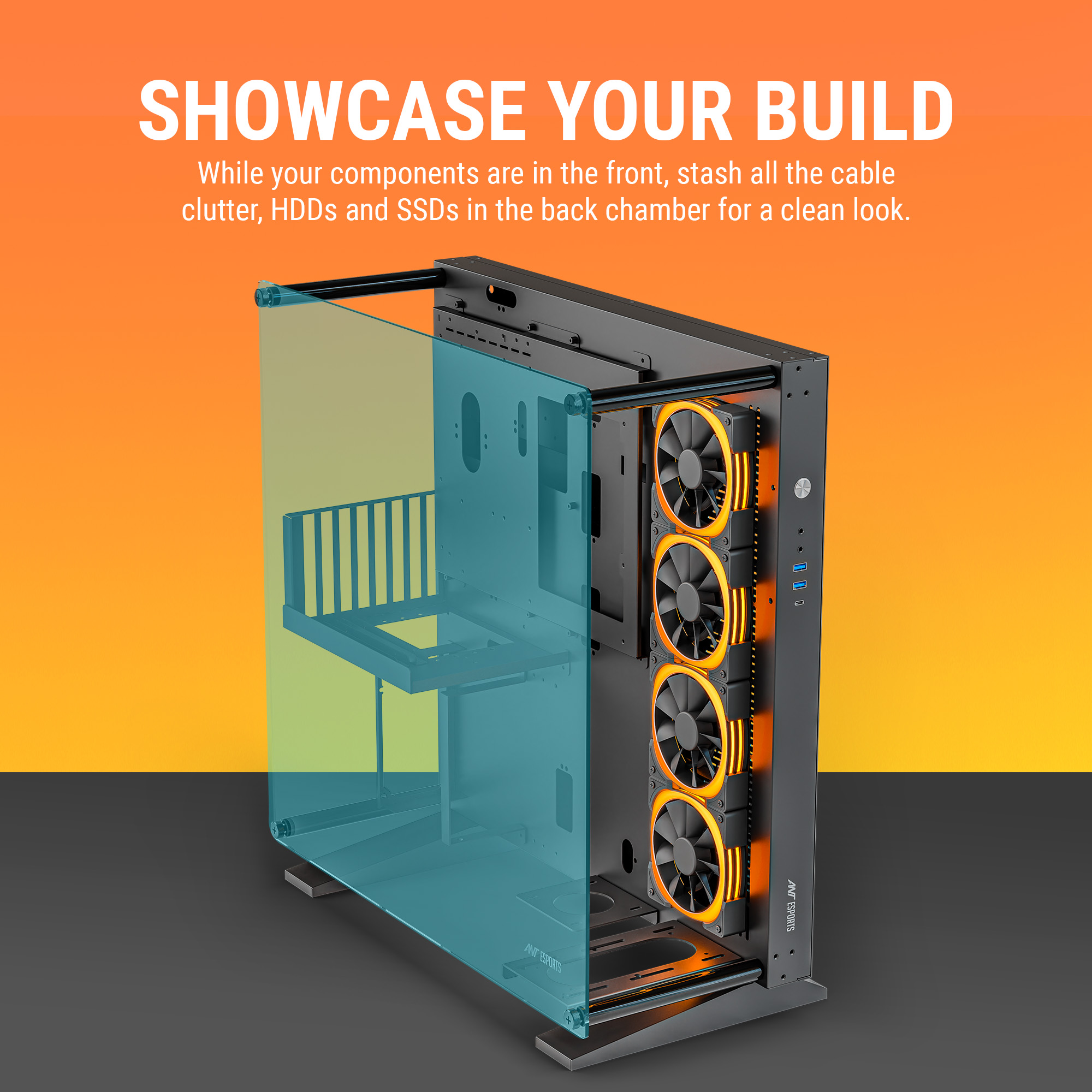 An open-frame layout crafted from SPCC steel and tempered glass ensures maximum ventilation and a stunning panoramic display of your components.