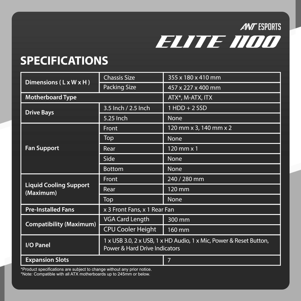 The IO panel features one USB 3.0 port, two USB 2.0 ports, and standard audio jacks for convenient connectivity. With support for motherboards up to ATX standards and PSUs up to 200mm in length, the Ant Esports 1100 Elite is not just a cabinet; it’s a futuristic gaming statement that combines form and function for an unparalleled gaming experience. Elevate your gaming rig with the Ant Esports 1100 Elite and step into the next generation of gaming aesthetics.