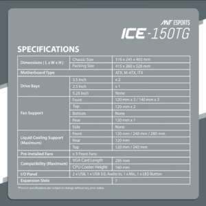 - Eye-catching Aesthetics: The Ant Esports ICE 150TG combines sleek aesthetics with functionality. Its unique front mesh design, tempered glass side panel, and compact form factor create an eye-catching appearance that enhances the overall visual appeal of your gaming setup. The case’s stylish design is sure to impress and make a statement among other gaming cabinets.