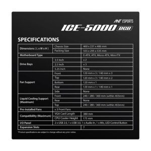 The Ant Esports ICE-5000 is designed to impress and build to deliver high airflow under all circumstances. With a mid-tower design that’s engineered to maximize space utilization, the ICE-5000 can easily house motherboards up upto E-ATX standards and have a perforated PSU shroud to provide tertiary cooling solutions. A slid-able HDD cage underneath the PSU shroud not only makes it modular but also allows the installation of higher-wattage power supplies that are long and needed for workstation builds.