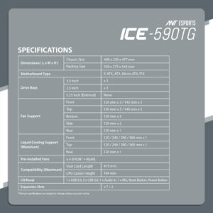 - Advanced Cooling System: The Ant Esports ICE-590TG comes equipped with four pre-installed 120mm ARGB fans, providing excellent airflow and vibrant lighting effects right out of the box. With support for up to twelve 120mm fans in total, users have the flexibility to customize their cooling setup for optimal thermal performance.
