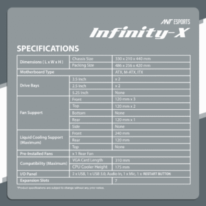 The Ant Esports Infinity X is not just a cabinet; it’s a statement of your passion for gaming. Its unique infinity mirror design, optimized cooling, ample storage capacity, and compatibility with high-end components make it the perfect choice for gamers who seek both style and performance.