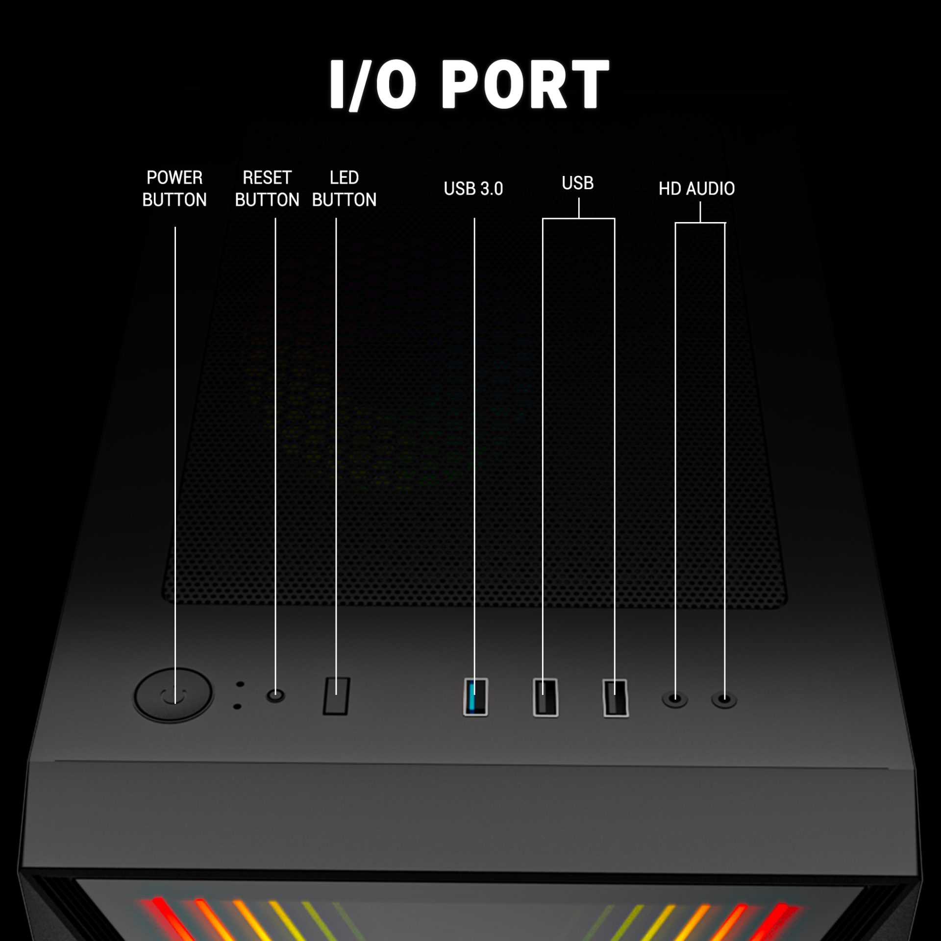 The Infinity X features a user-friendly I/O panel on the front, offering easy access to essential ports. With two USB 2.0 ports and one USB 3.0 port, you can effortlessly connect your peripherals and enjoy high-speed data transfer for quick file transfers and seamless gaming experiences.