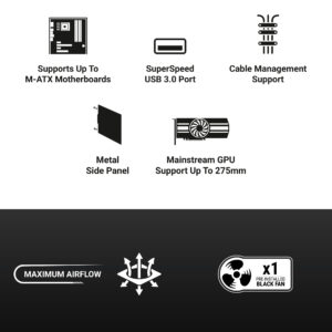 The Ant Esports SI12 is a compact small-form-factor PC case built with a sturdy metal construction and designed for Micro-ATX and Mini-ITX systems. It features a pre-installed 120mm rear fan for efficient airflow, supports GPUs up to 275mm, CPU coolers up to 160mm, and offers storage for 1 HDD + 2 SSDs. With its minimalist design and essential front I/O—including USB 3.0, dual USB ports, and HD audio—the SI12 is perfect for modern workstations, compact desktops, and space-saving builds.
