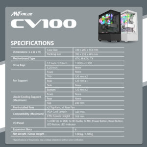 Ant Value CV100 Mid-Tower (M-ATX/ITX) Gaming Cabinet White 3x120mm Fans