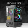 The tempered glass side panel adds a premium touch, offering a full view of the RGB components inside. The front I/O includes USB 3.0, USB 2.0, HD Audio, Mic input, Power & Reset buttons, and dedicated drive indicators, ensuring convenient, modern connectivity.