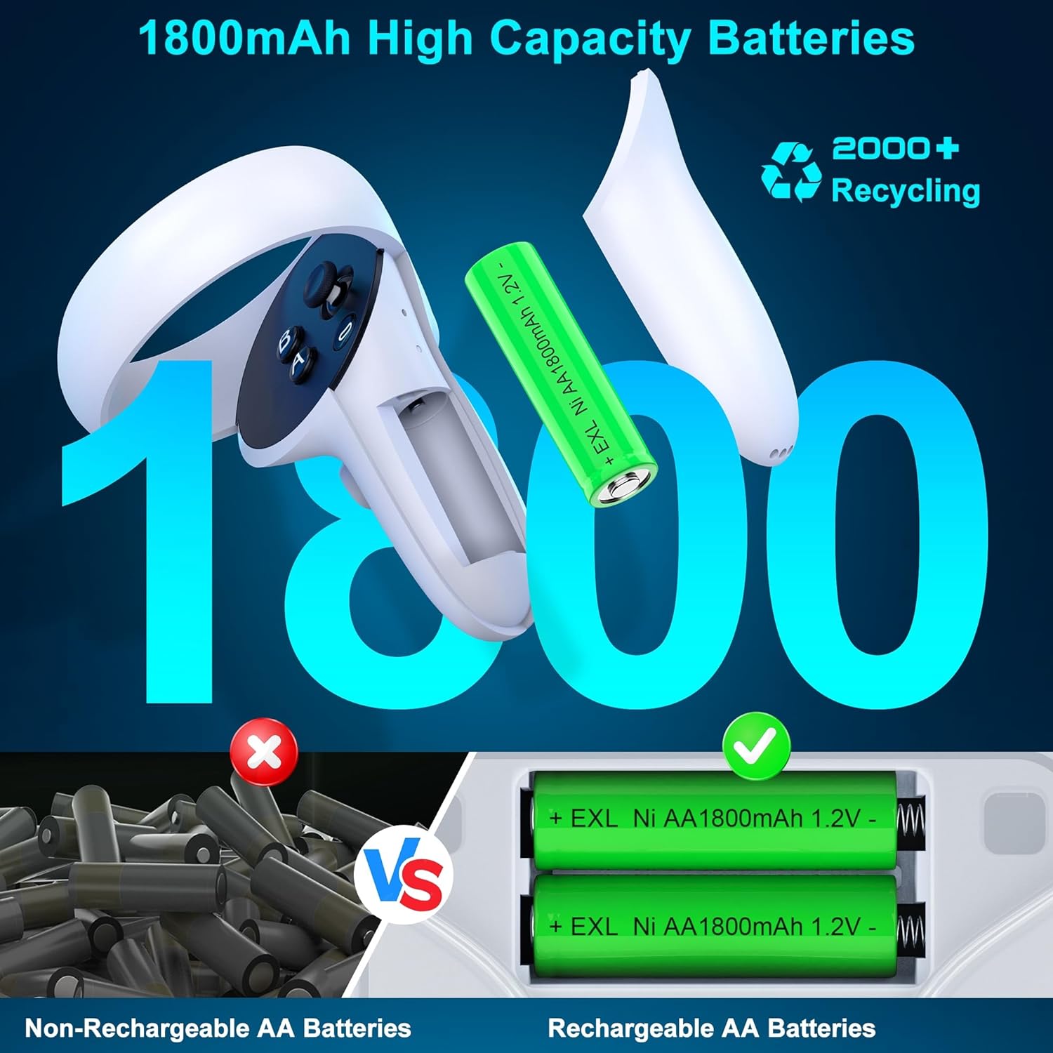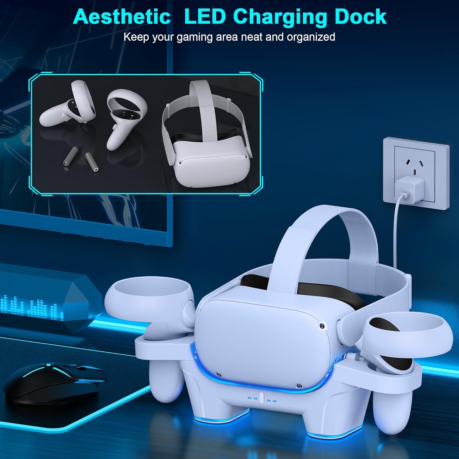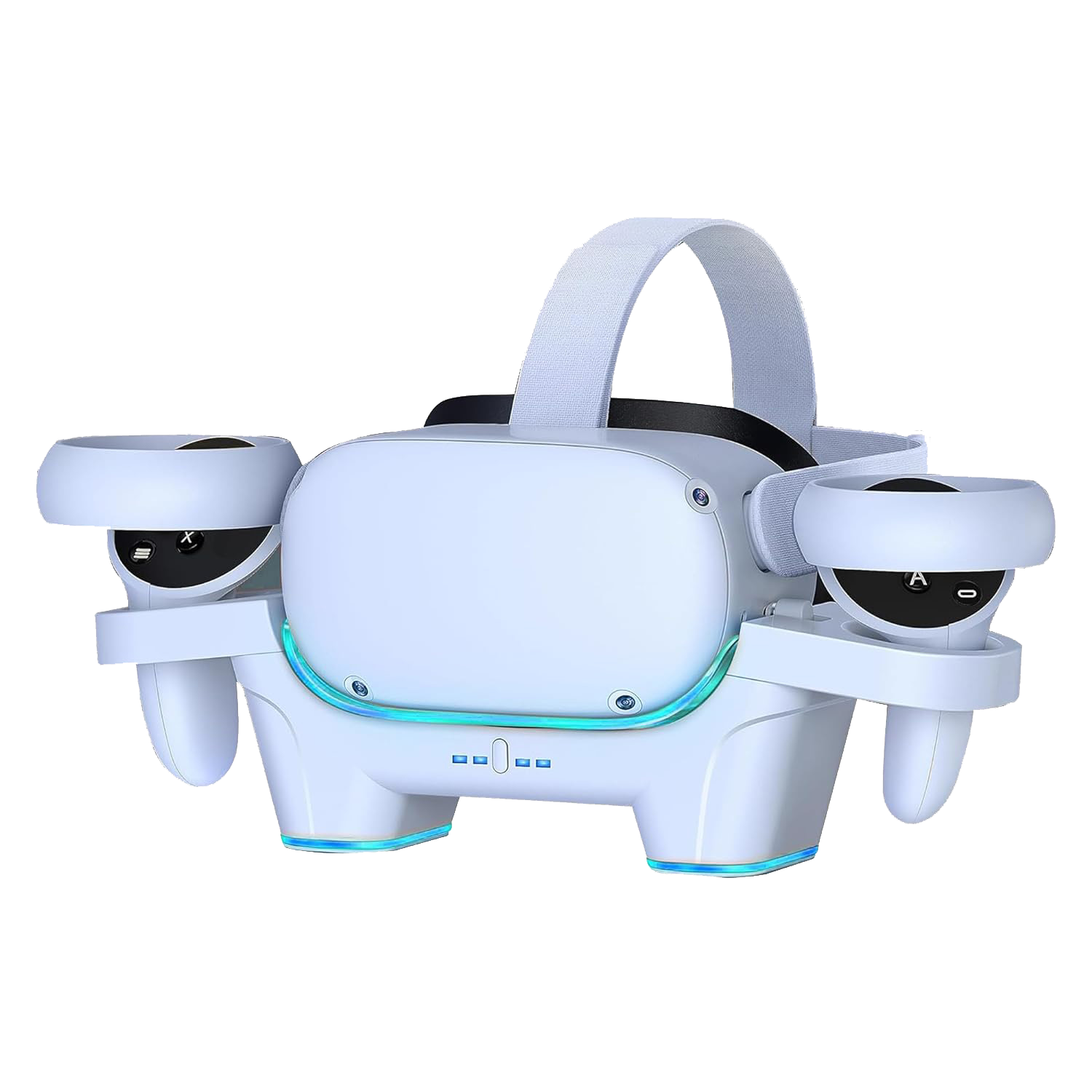 Ant Esports VR Charger Station Compatible with Oculus/meta 3 Quest 3 / 3S, RGB Light Fast Charging Dock Replacement,Headset Display Stand and Controller Mount with 2 Rechargeable Batteries – White