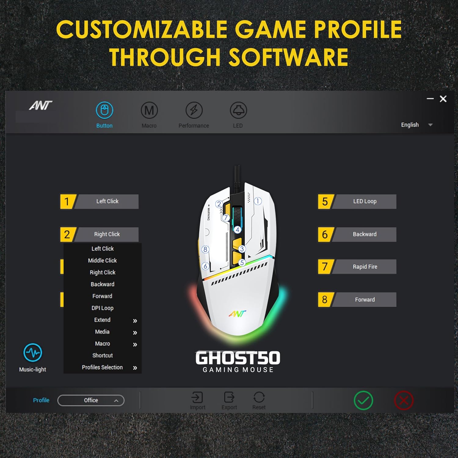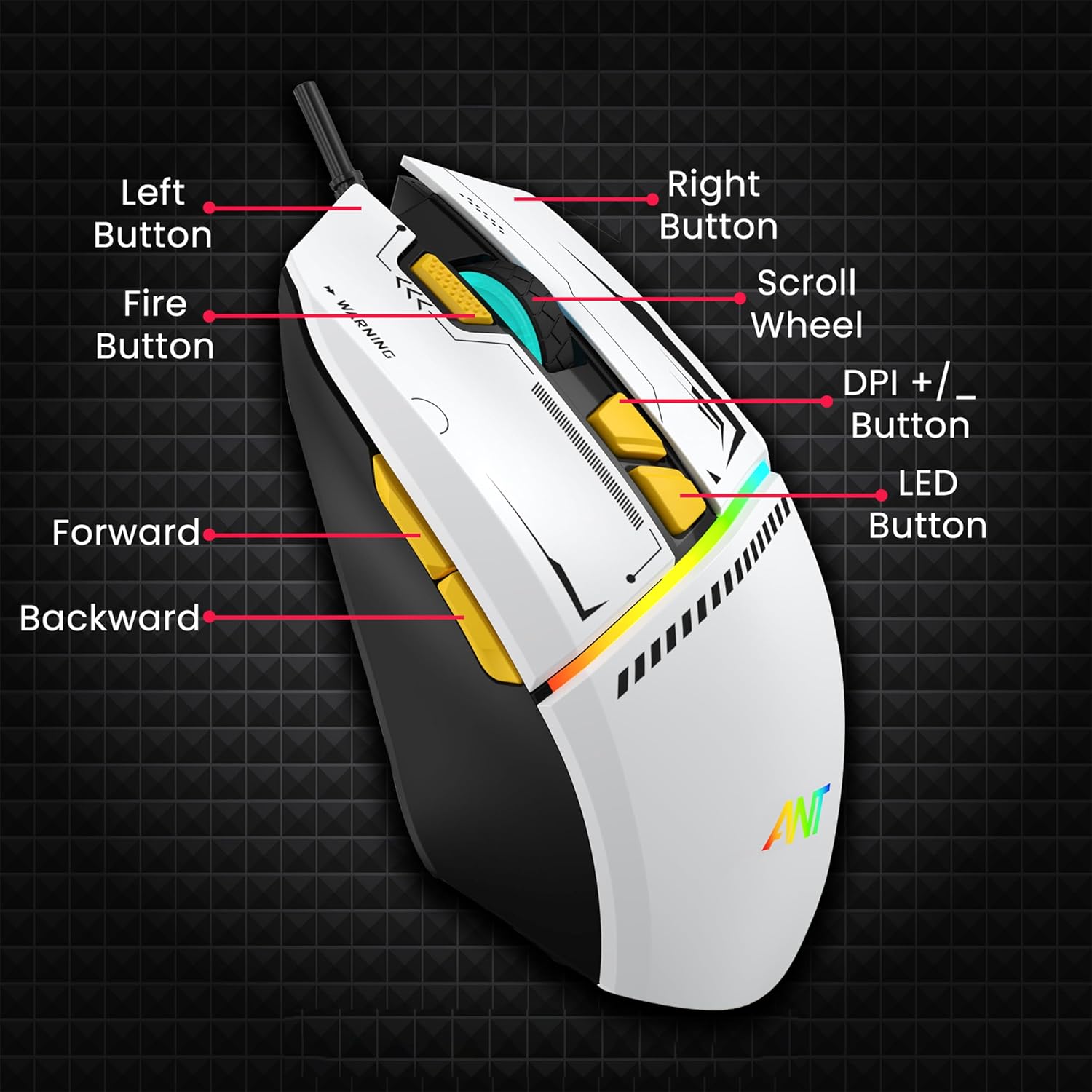 Ant Ghost 50 Plug and Play RGB 8 Programable Buttons High End 12800 DPI 1000hz Pooling Rate Optical Ergonomic Wired Gaming Mouse Latest Inbuilt Software Huano Switches -White