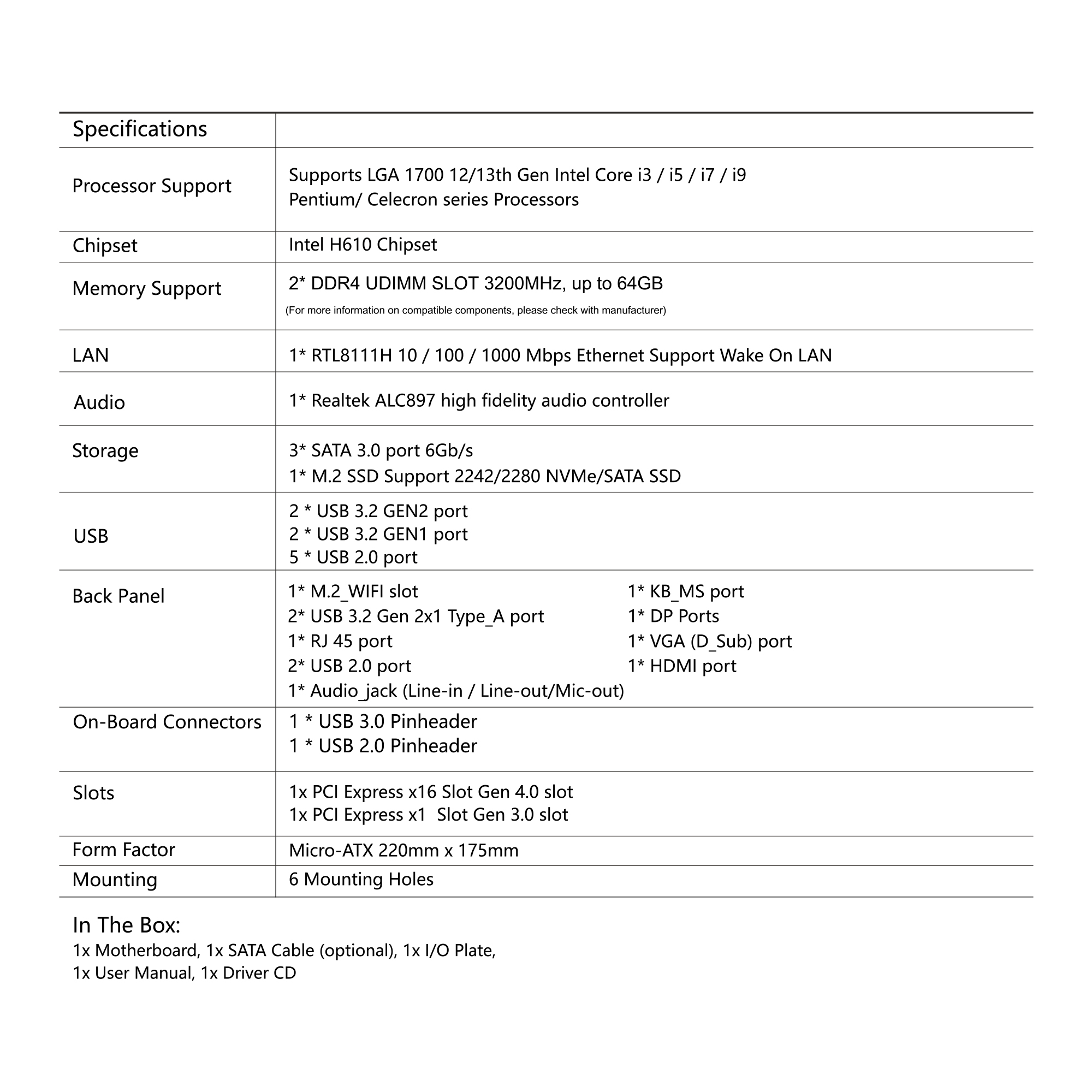 - LGA 1700 CPU Support: The Ant Value H610MAD4-N motherboard is designed to support LGA 1700 socket-based Intel CPUs. This ensures compatibility with the latest generation of Intel processors, enabling you to build a powerful and up-to-date system.