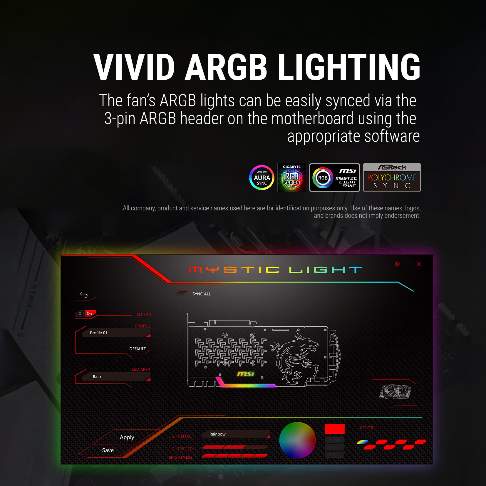 - Universal Compatibility and Easy Control: With a 4-pin PWM connector for fan speed control through your motherboard’s BIOS settings and a 3-pin ARGB 5V connector, the Spectraflow offers universal compatibility. Take command of the ARGB colors and effects effortlessly using popular motherboard ARGB utilities such as Asus Aura, Gigabyte Fusion, MSI Mystic Light, and more, customizing your setup to match your unique style.