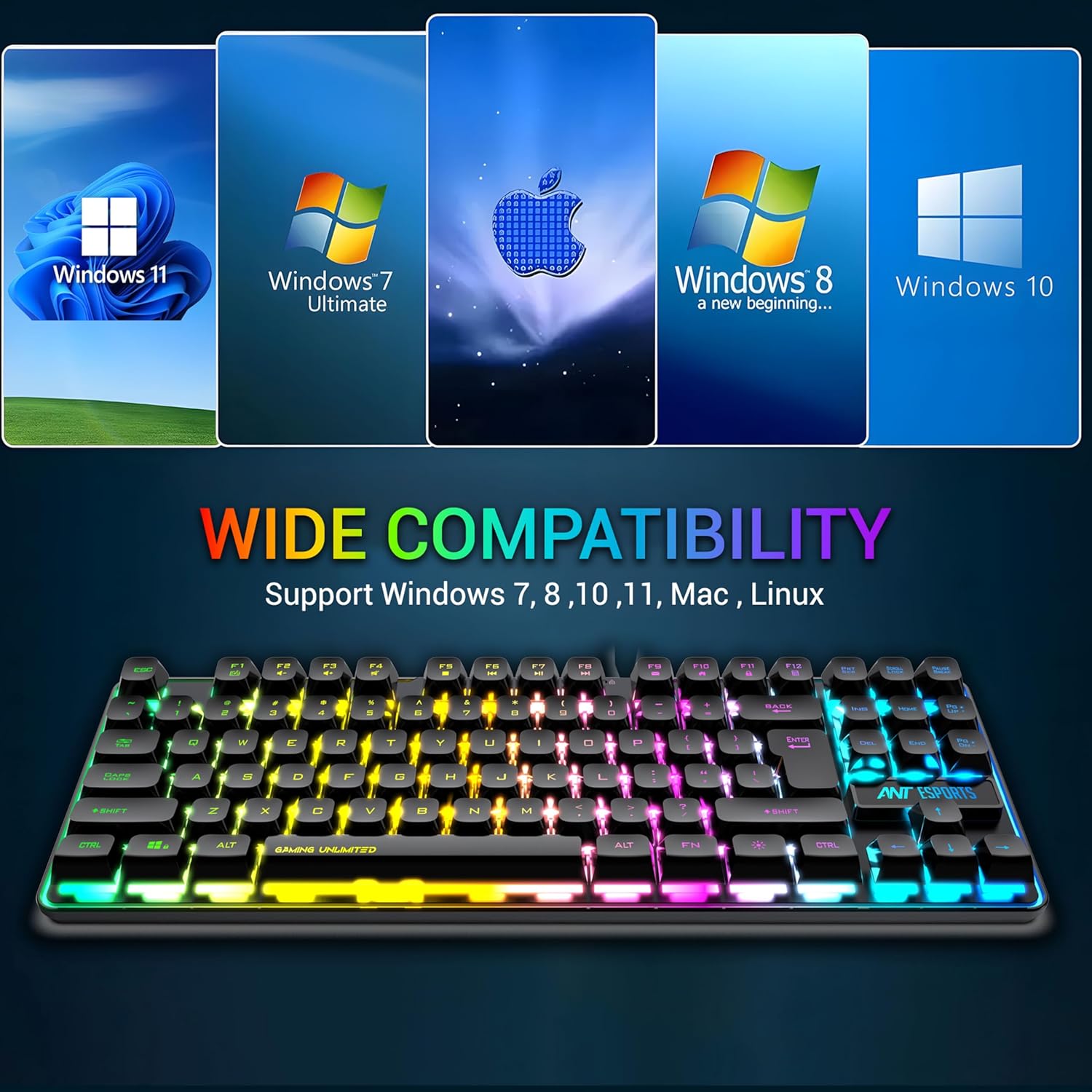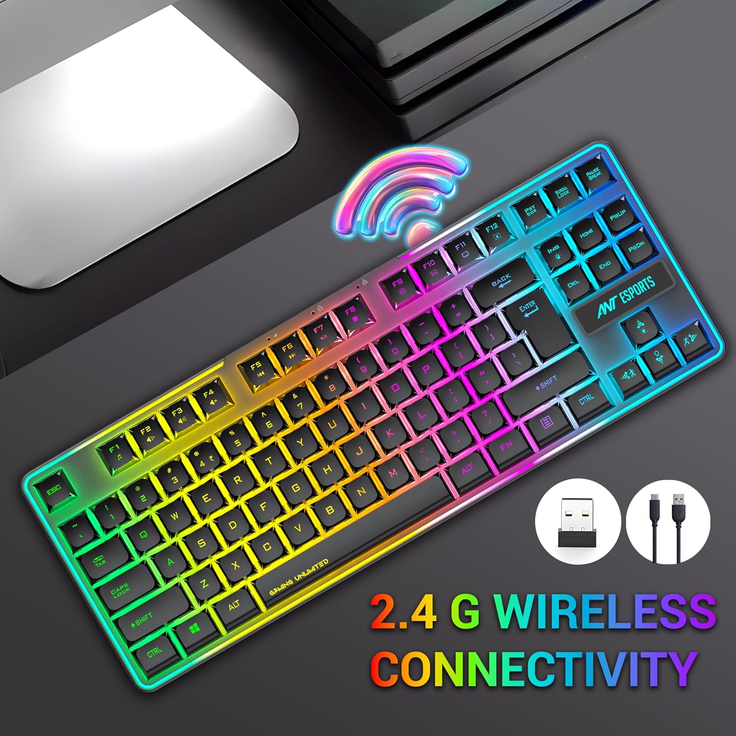Ant Esports MK720 Pro V2 Wireless TKL RGB Gaming Membrane Keyboard, Backlit Wireless – Long Lasting Rechargeable Battery – Quite Water-Resistant Ergonomics Keyboard – PC PS5 PS4 Xbox One Mac – Black