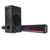 Connect effortlessly using AUX or embrace the wireless freedom of Bluetooth 5.0 connectivity, and even play your favorite tunes directly from a USB drive. With the convenience of an included remote, take control of your audio experience on the fly. Choose from four EQ modes for customized sound profiles tailored to gaming, movies, or music. The sleek all-black construction, combined with vibrant RGB lights on the soundbar, adds an elegant touch to your setup.