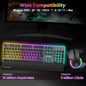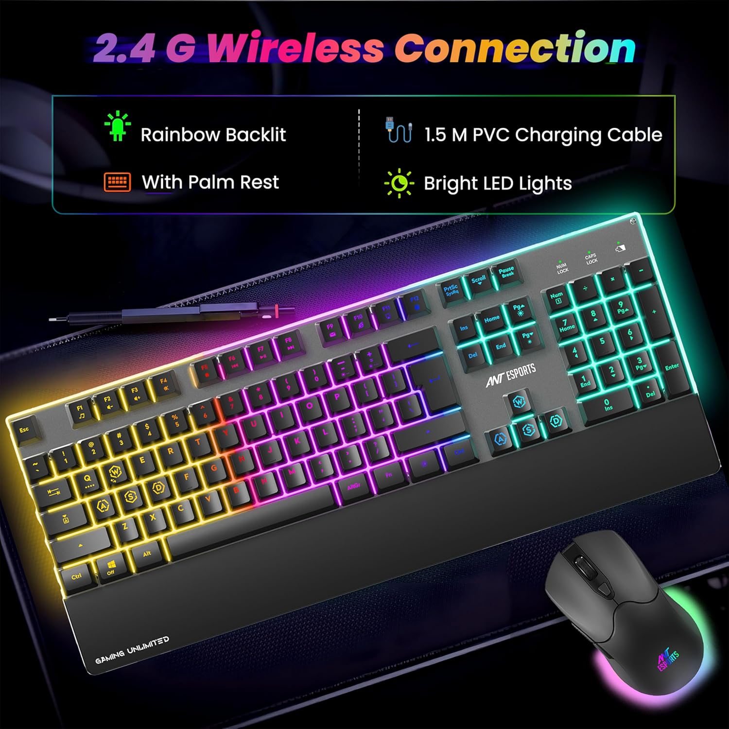 Developed by Ant Esports, the keyboard showcases multi-zone RGB lighting with floating keycaps that produce sharp, vibrant illumination. The included wrist rest provides exceptional ergonomic support, ensuring comfort during long gaming marathons or extended typing sessions. With durable construction and a smooth matte finish, the keyboard offers reliability and style in one package.