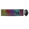 The Thunder 30 Gaming Keyboard & Mouse Combo features a full-size RGB keyboard with a sleek black frame and rainbow backlighting that highlights each row of keys in distinct colors. The floating keycap design enhances visibility and adds a mechanical-inspired look while maintaining comfortable, responsive membrane typing. Dedicated arrow keys and a numeric keypad support gaming shortcuts and productivity tasks.