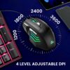 The accompanying RGB gaming mouse features a futuristic angular design with multiple side buttons for enhanced control. Its contoured shape provides a comfortable grip, while the illuminated scroll wheel and glowing logo add a premium touch. A DPI switch near the scroll wheel allows quick sensitivity adjustments, ideal for scenarios that require instant precision changes.