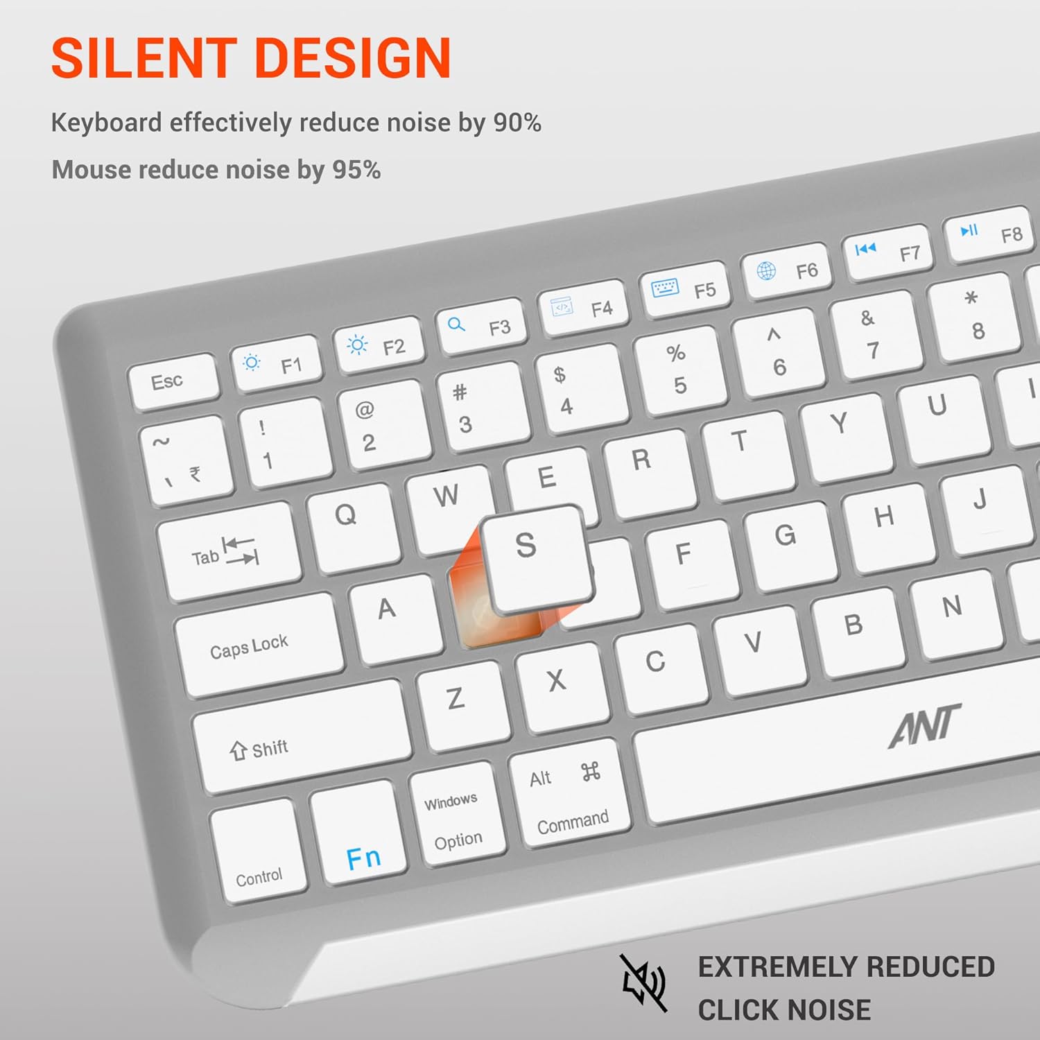 The WK250 Wireless Keyboard & Mouse Combo features a sleek and stylish design with a white key layout framed by a silver-toned top panel, delivering a clean and modern aesthetic. The full-size keyboard includes well-spaced low-profile keys for quiet and comfortable typing, along with a dedicated number pad for enhanced productivity.