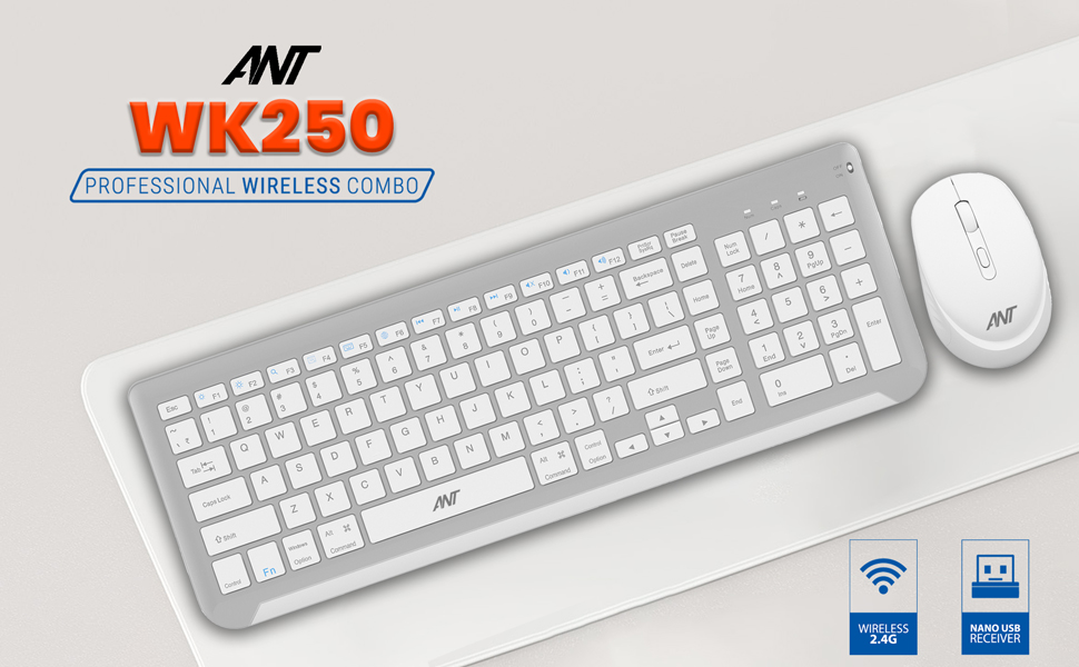 Experience effortless productivity with the WK250 Wireless Keyboard & Mouse Combo, a beautifully designed full-size set perfect for professional workspaces, homes, and hybrid environments. Featuring a clean white-and-silver finish, the WK250 adds a touch of elegance to any desk while delivering a quiet and fluid typing experience.