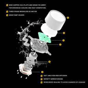 The premium pump head features a glossy, illuminated ARGB ring that enhances visual appeal while delivering reliable cooling performance. Designed with precision, it ensures optimal coolant circulation and quiet operation.