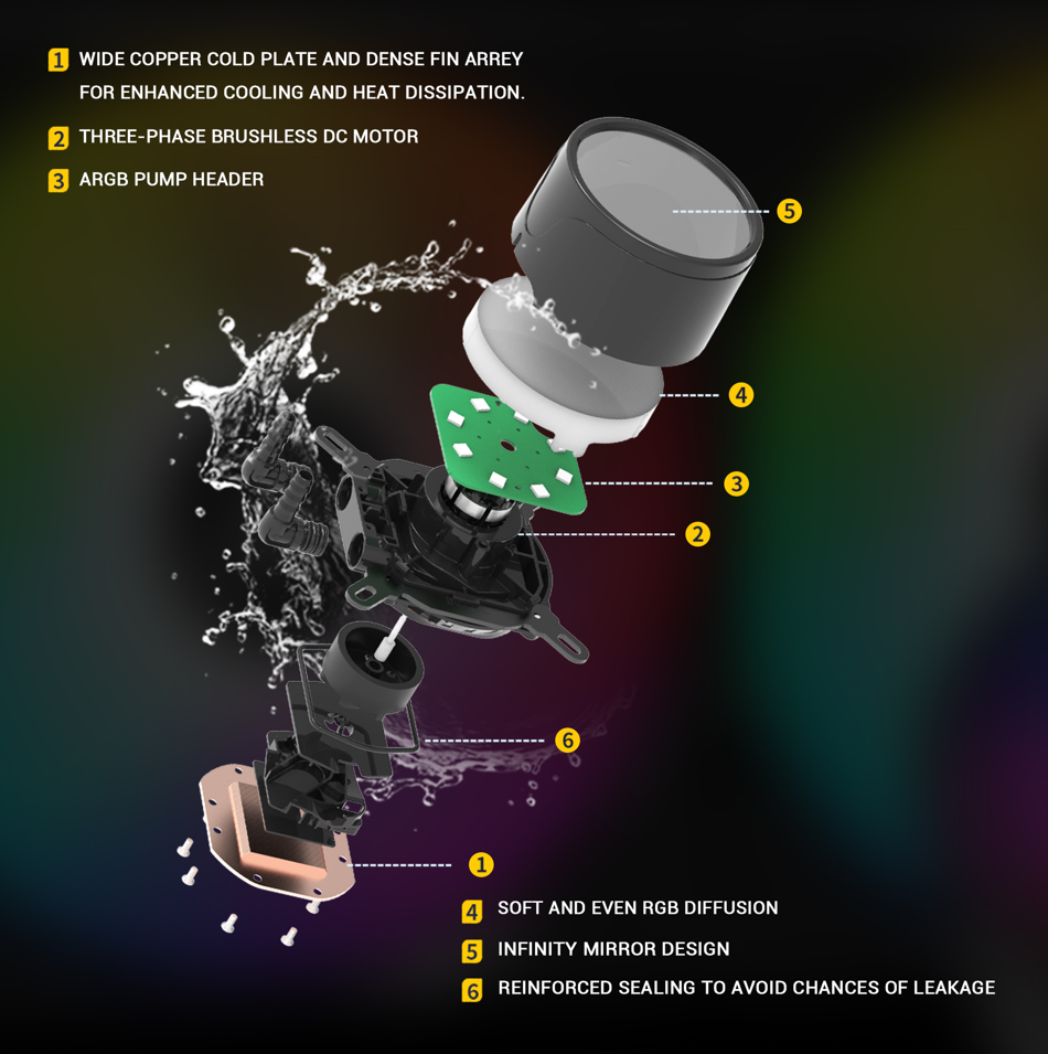 A custom made wide copper cold plate makes even and proper contact with modern day CPUs and along with a dense micro-channel array guarantees optimum heat transfer to deliver lower temperatures even under full load. Paired with EPDM tubing encased in meshed fabric the ICE-360 is designed to last long by lowering down the possibility of permeability of liquid over time even under high temperatures. The radiator is made out of high grade aluminum and with a thick fin stack provides large surface area for heat dissipation.