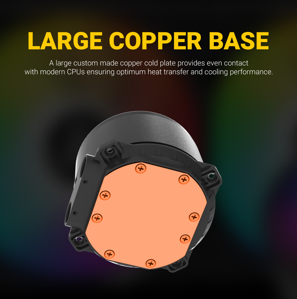 - Custom Cold Plate – A wide custom made copper cold plate not only ensures even and better contact with the CPU but with a thick micro-fin array delivers high heat transfer even under high loads.